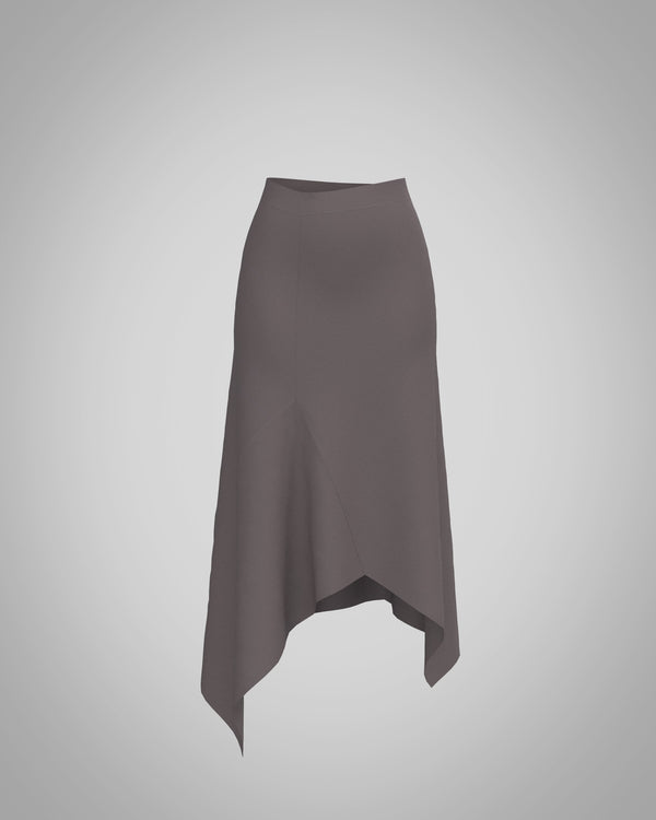 Fustă midi moale și fluidă, concepută pentru purtare fără efort. Croită peste genunchi, are un tiv asimetric care creează mișcare în timp ce talia elastică asigură confort și versatilitate.